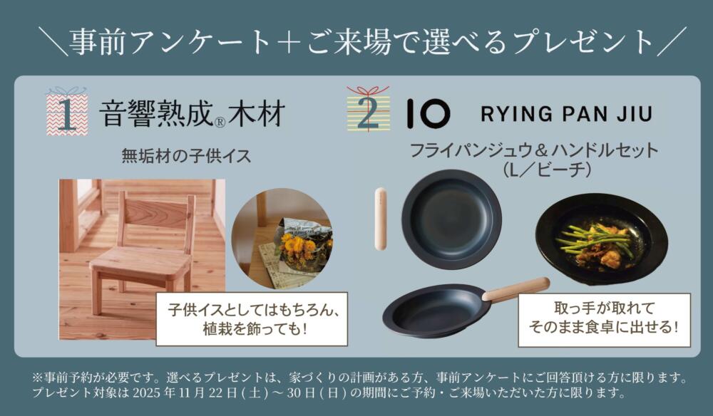 事前アンケートにご回答のうえ、ご来場頂くことで【無垢材の子供イス】または【鉄フライパンジュウセット】をプレゼントさせて頂きます。