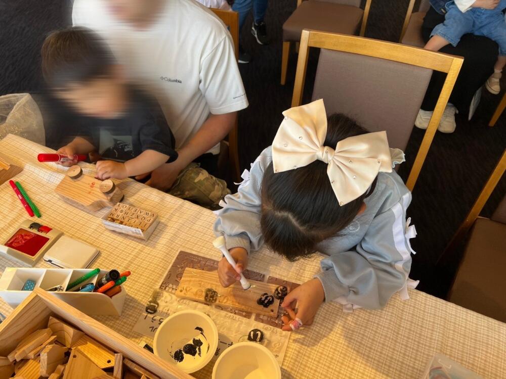 スタンプやステンシル・ペンで木材にイラストを描いてキーホルダー作りを楽しんでくれました。