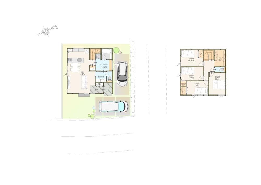 1階には18帖の広々LDK。キッチン横に配した3.5帖のランドリールーム。脱ぐ・洗う・干すが1箇所で完結し、家事時間を大幅に短縮します。