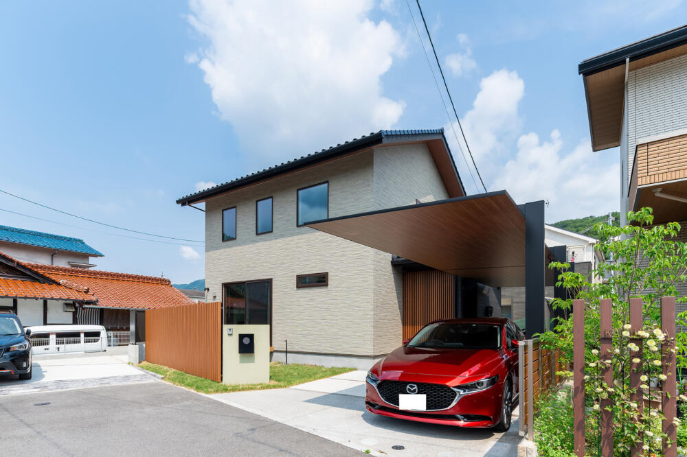 瓦屋根と格子を合わせることで和モダンを表現した外観。