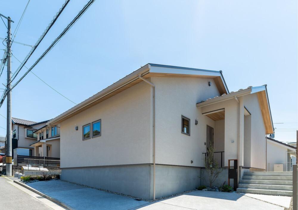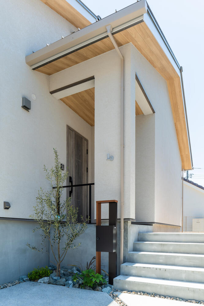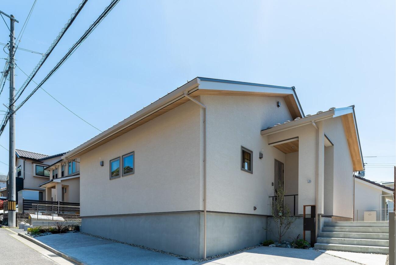 外壁塗り壁にはベージュ系ホワイト、軒天井を木目でコーディネートし、柔らかい雰囲気に。