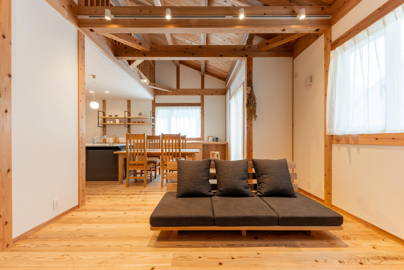 平屋特有の勾配天井を活かした設計により、帖数以上の広がりを感じる開放的な空間を実現しました。