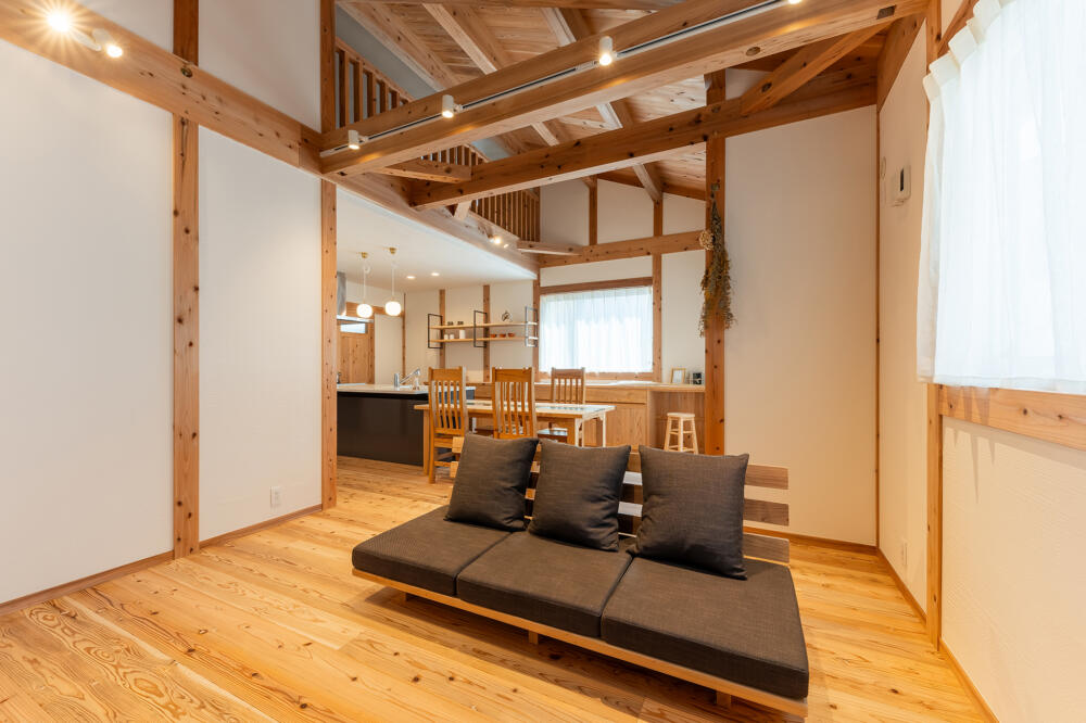 柱や梁を見せる真壁工法で無垢材(音響熟成木材)の温もりをより一層感じられます。