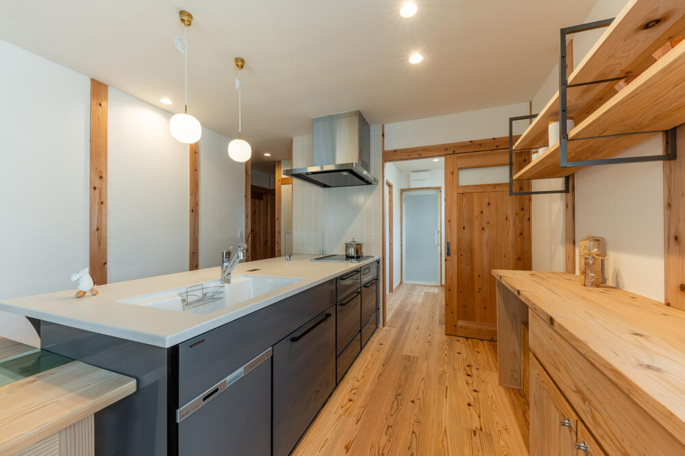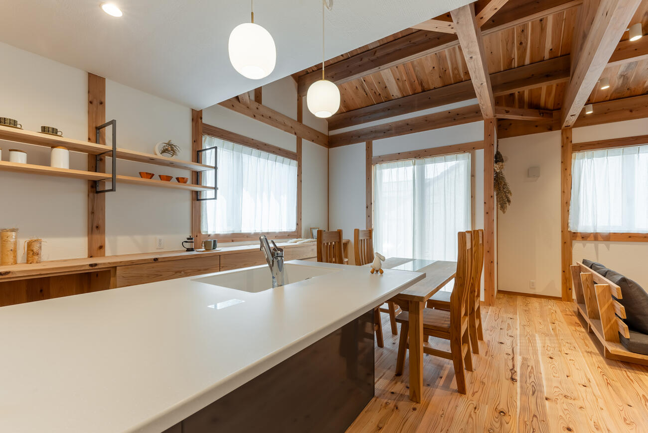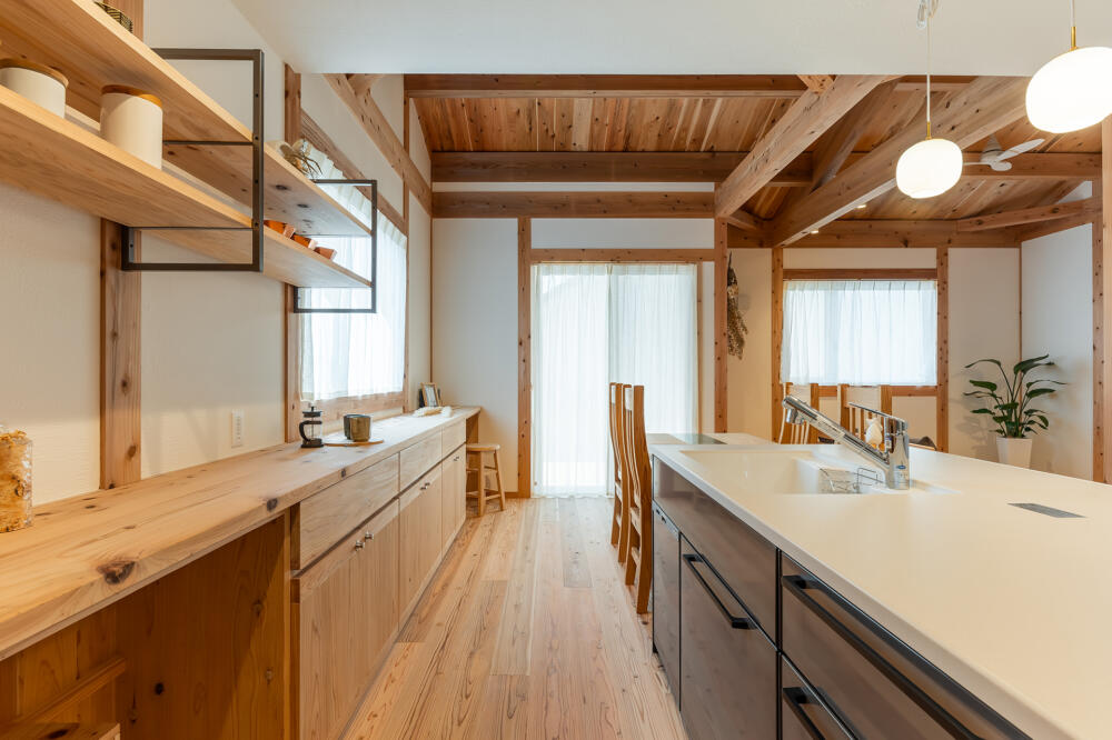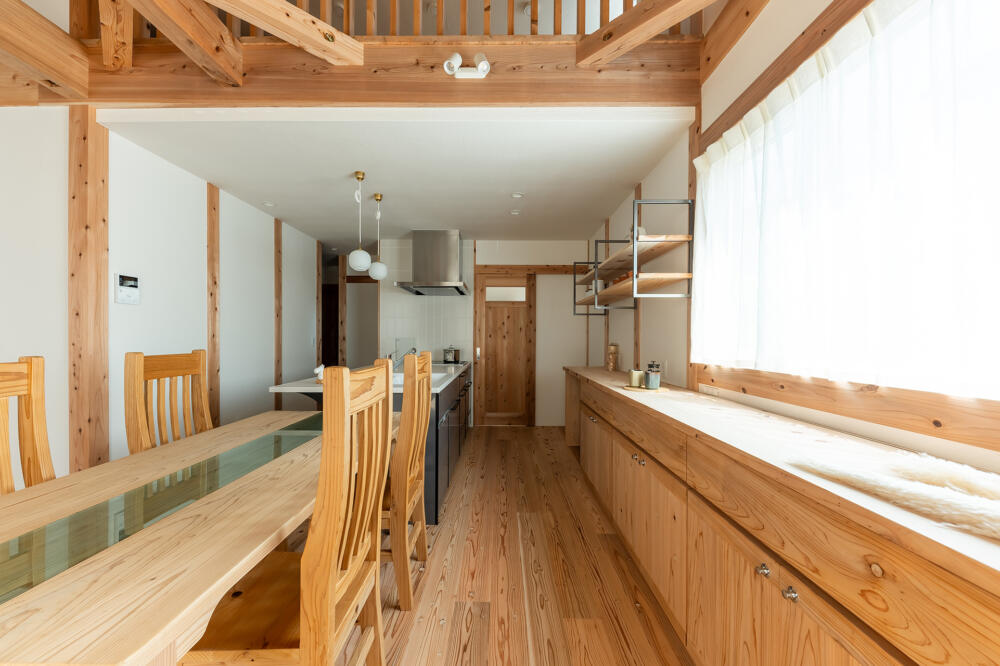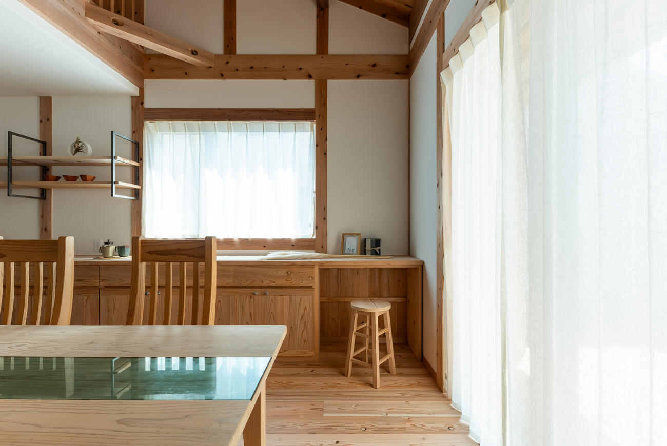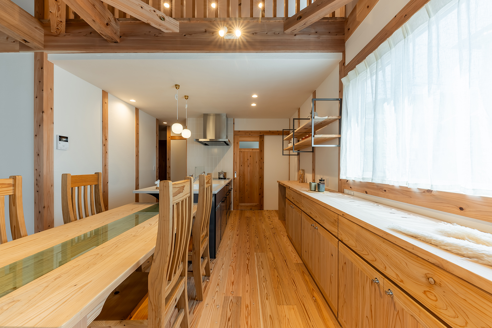 横並びのダイニングで配膳・片付けが楽に。テーブル、椅子も無垢杉(音響熟成木材)で造作しました。