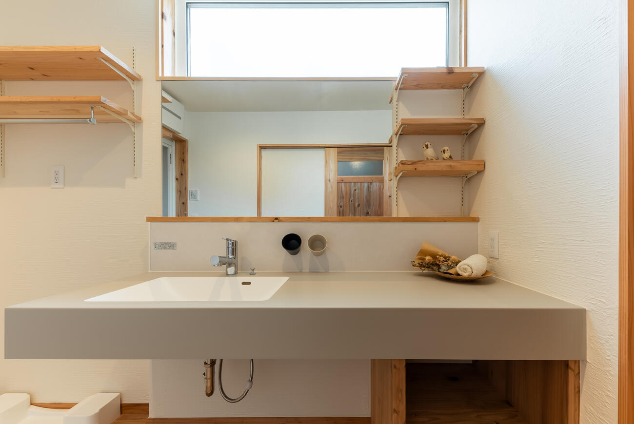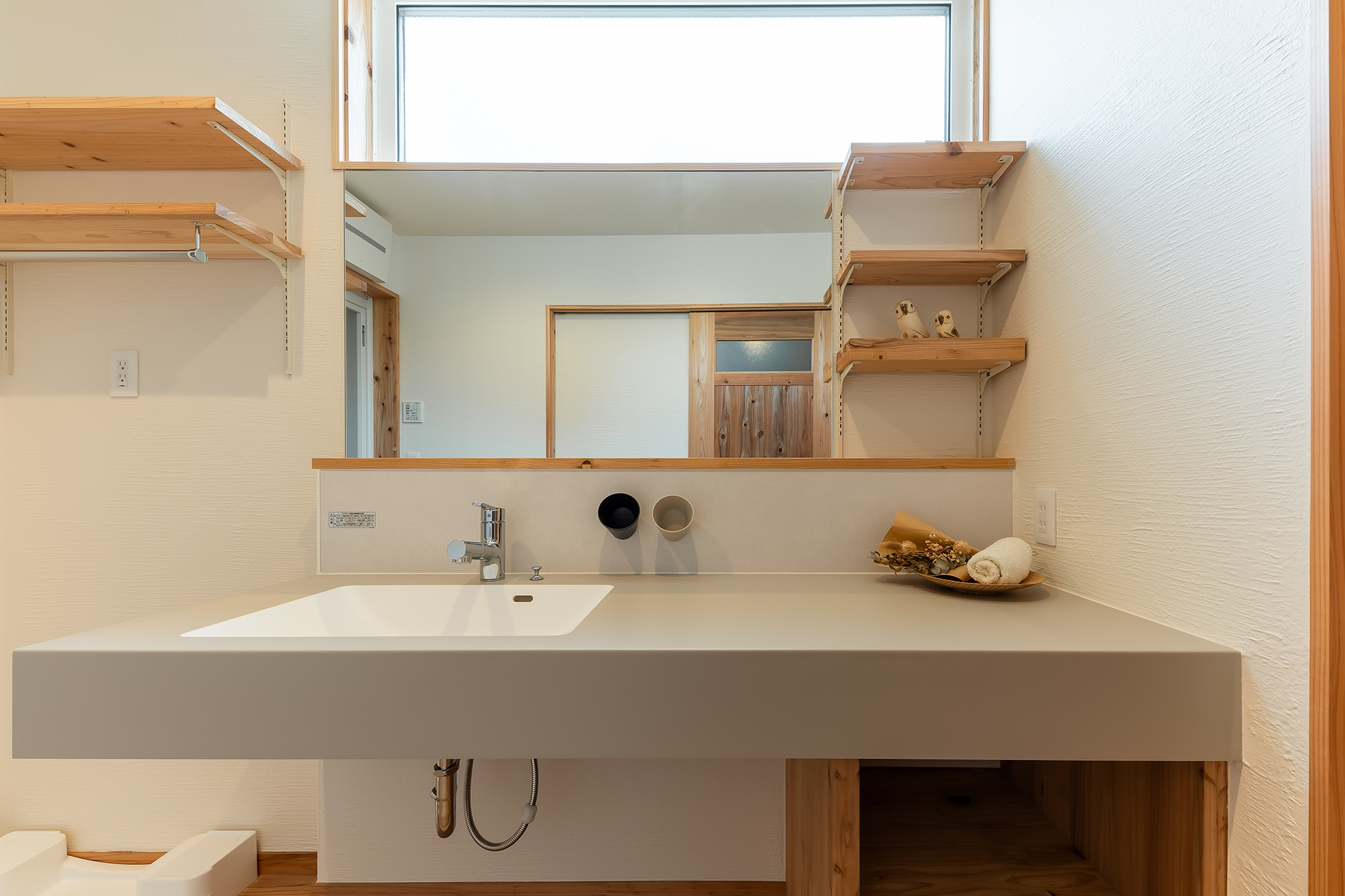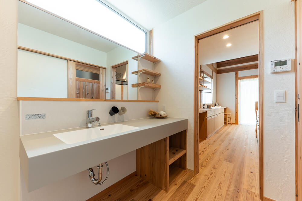 洗面はアイカの造作洗面となっており、カウンターや棚にも杉無垢材(音響熟成木材)を使用しています。