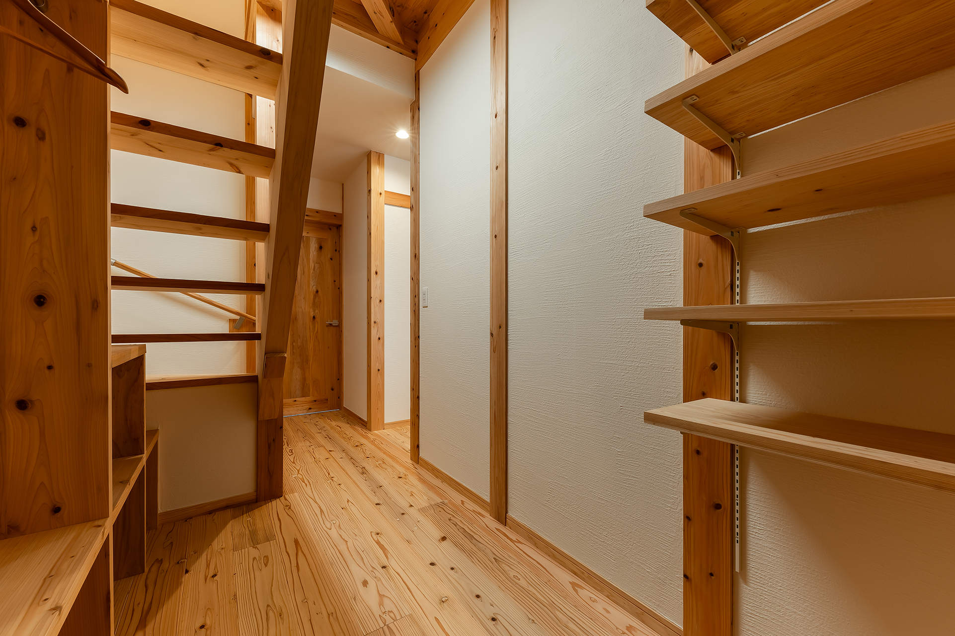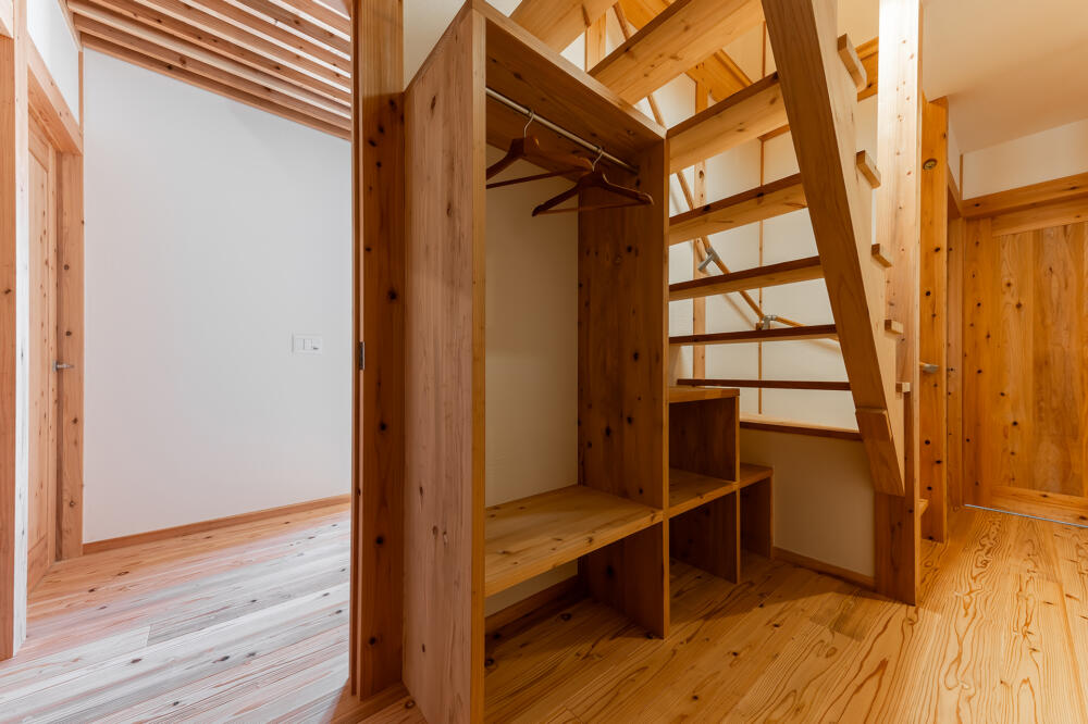ロフトにつながる階段下を利用した3帖のファミリークローク。