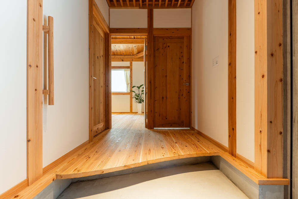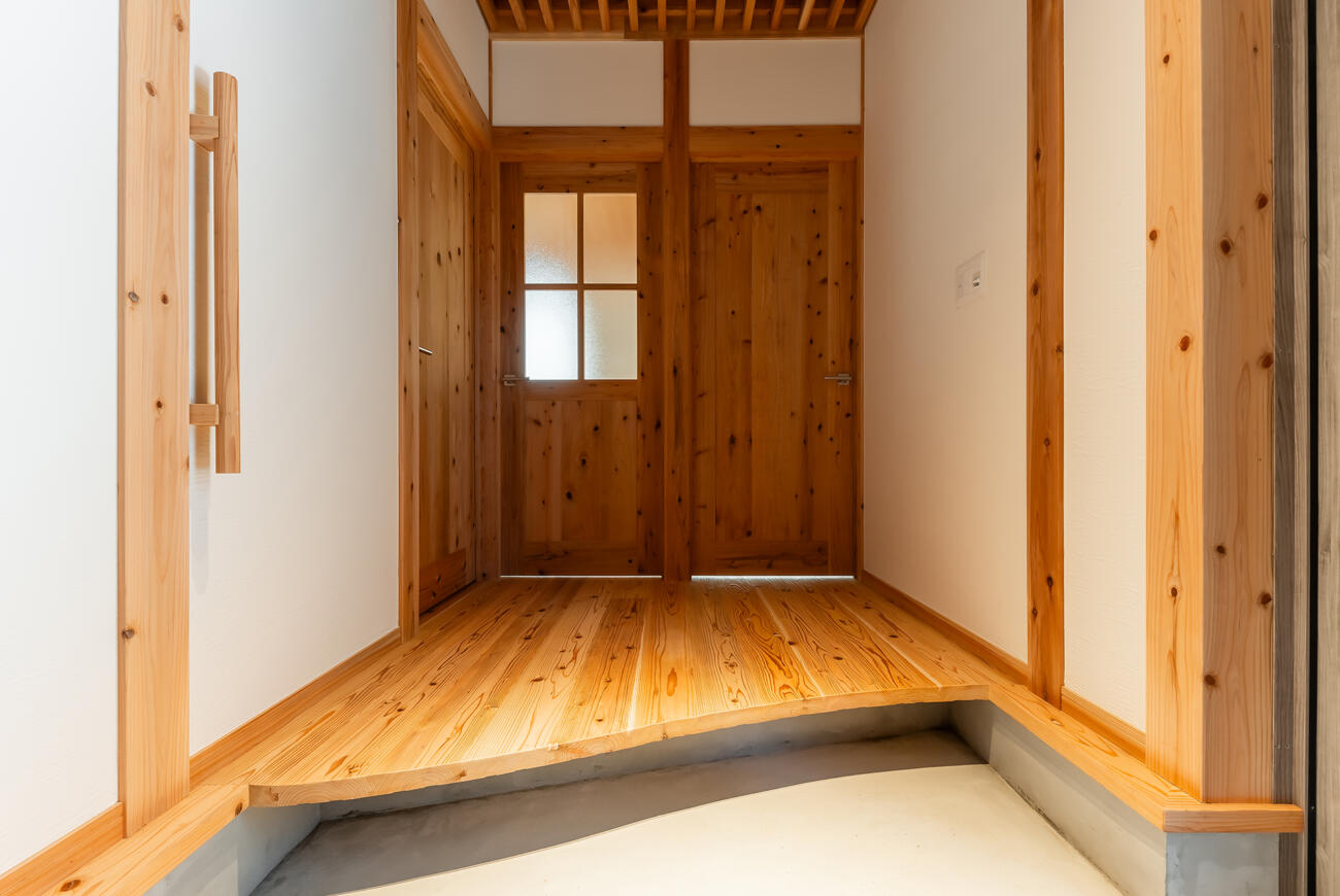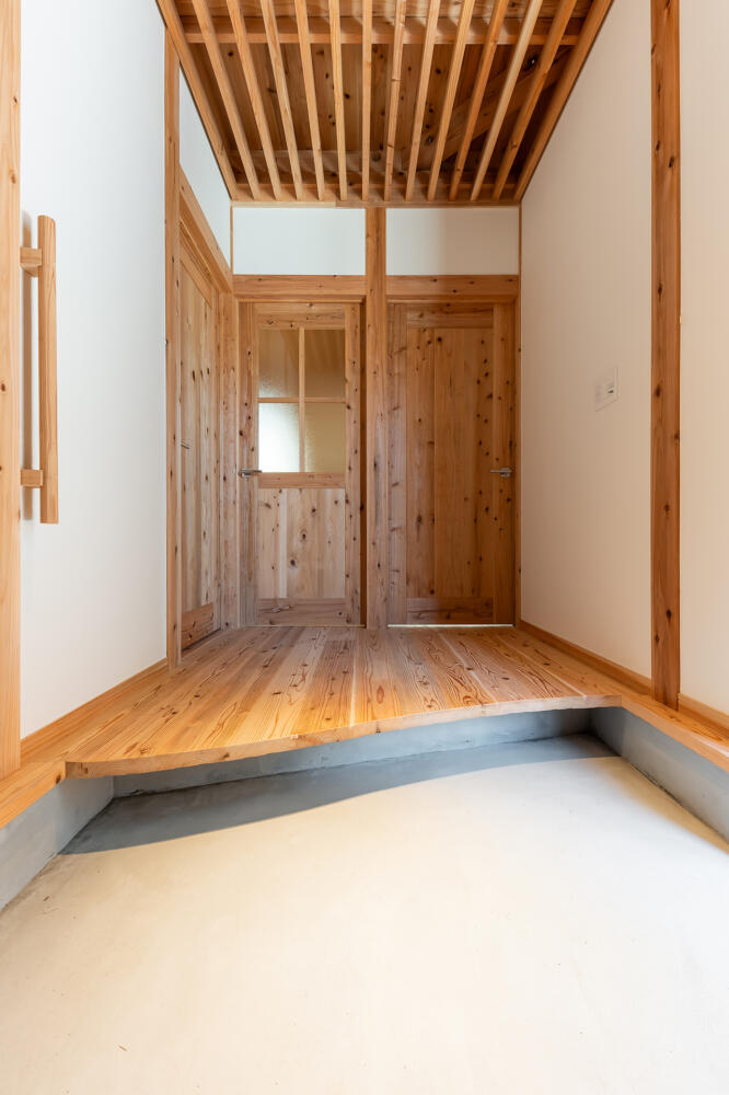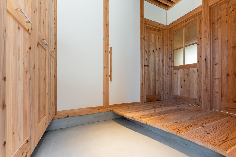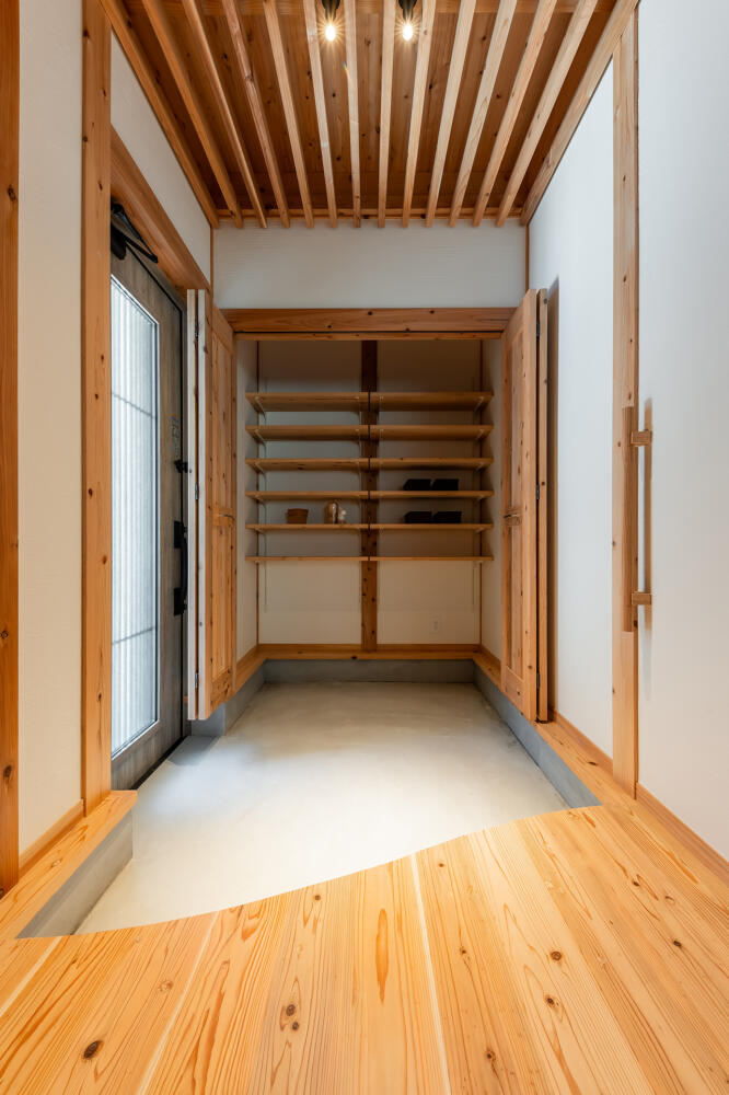 シューズクロークの扉にも杉無垢材(音響熟成木材)を仕様しています。