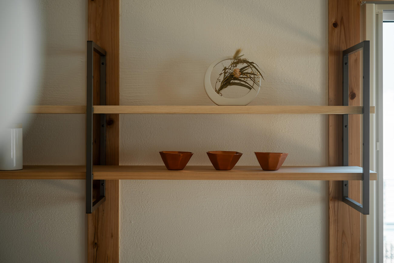 また、カップボードや飾り棚も杉無垢材(音響熟成木材)で造作。