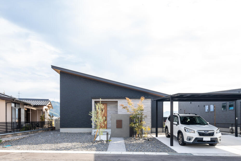 黒・グレー・茶系でまとめた、スタイリッシュな平屋。片流れ屋根で縦にも広がりを感じさせる外観に。