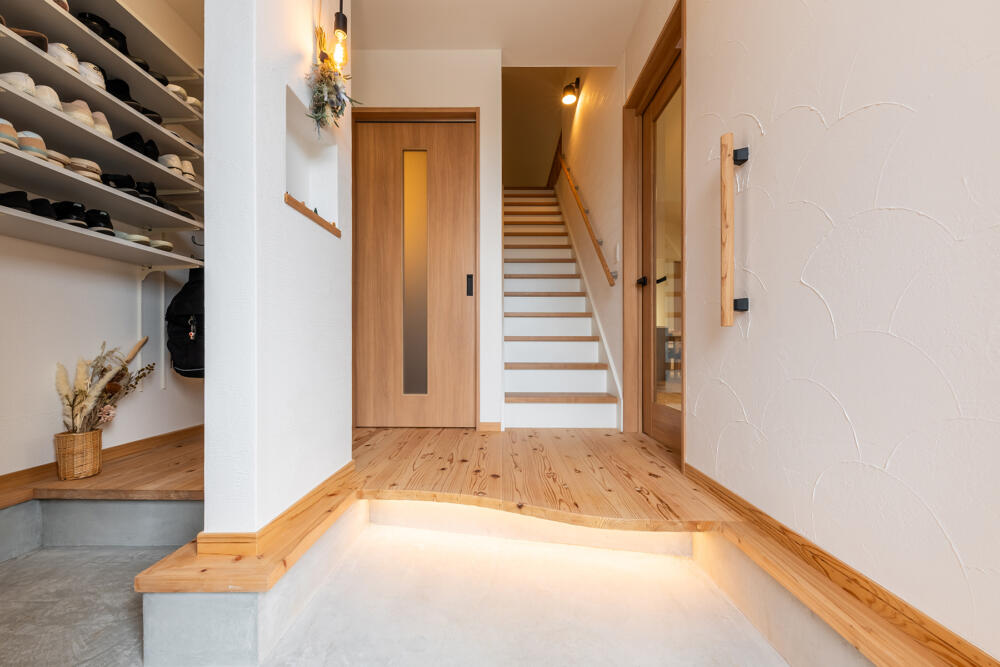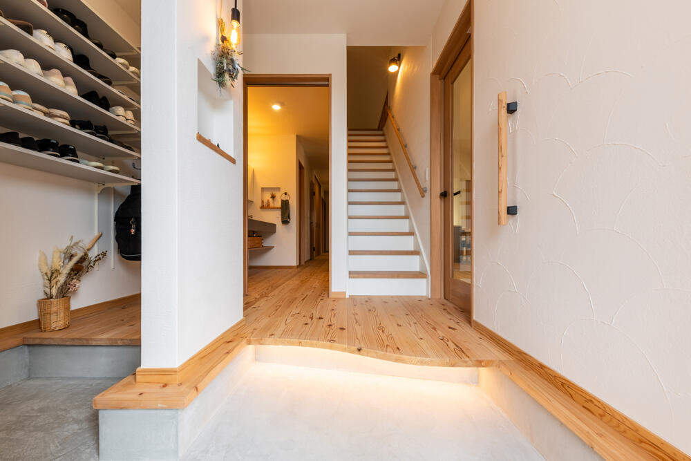 施主様がモデルハウスで気に入った無垢材の床、壁と天井全面に漆喰を採用した玄関。土間続きで左へ進むと、、、、