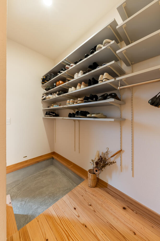 シューズクロークが横並びで繋がり、ウォークスルーできる設計。