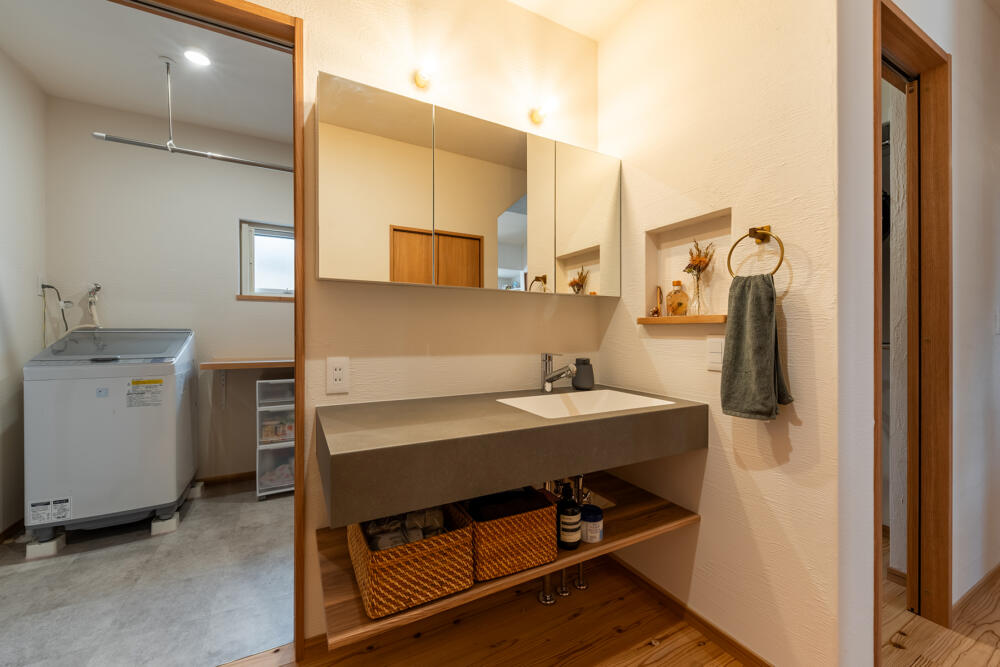 アイカの洗面カウンターに三面鏡や無垢材の素材を組み合わせ、使いやすさとデザイン性を両立させた造作洗面台。
