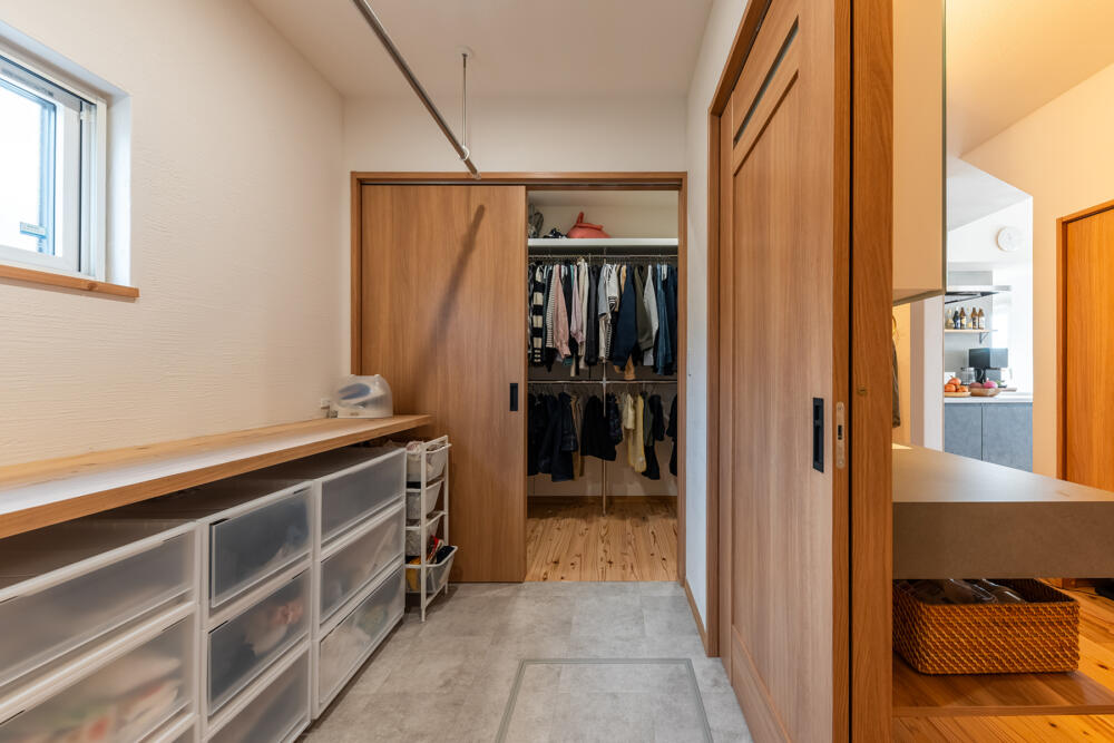 キッチン裏を活用した、家族分の衣類をまとめたファミリークロークが繋がります。外出前の身支度や帰宅時の着替えが、この空間ひとつで完結!
