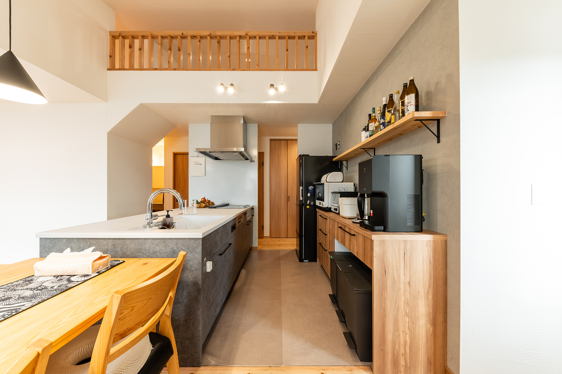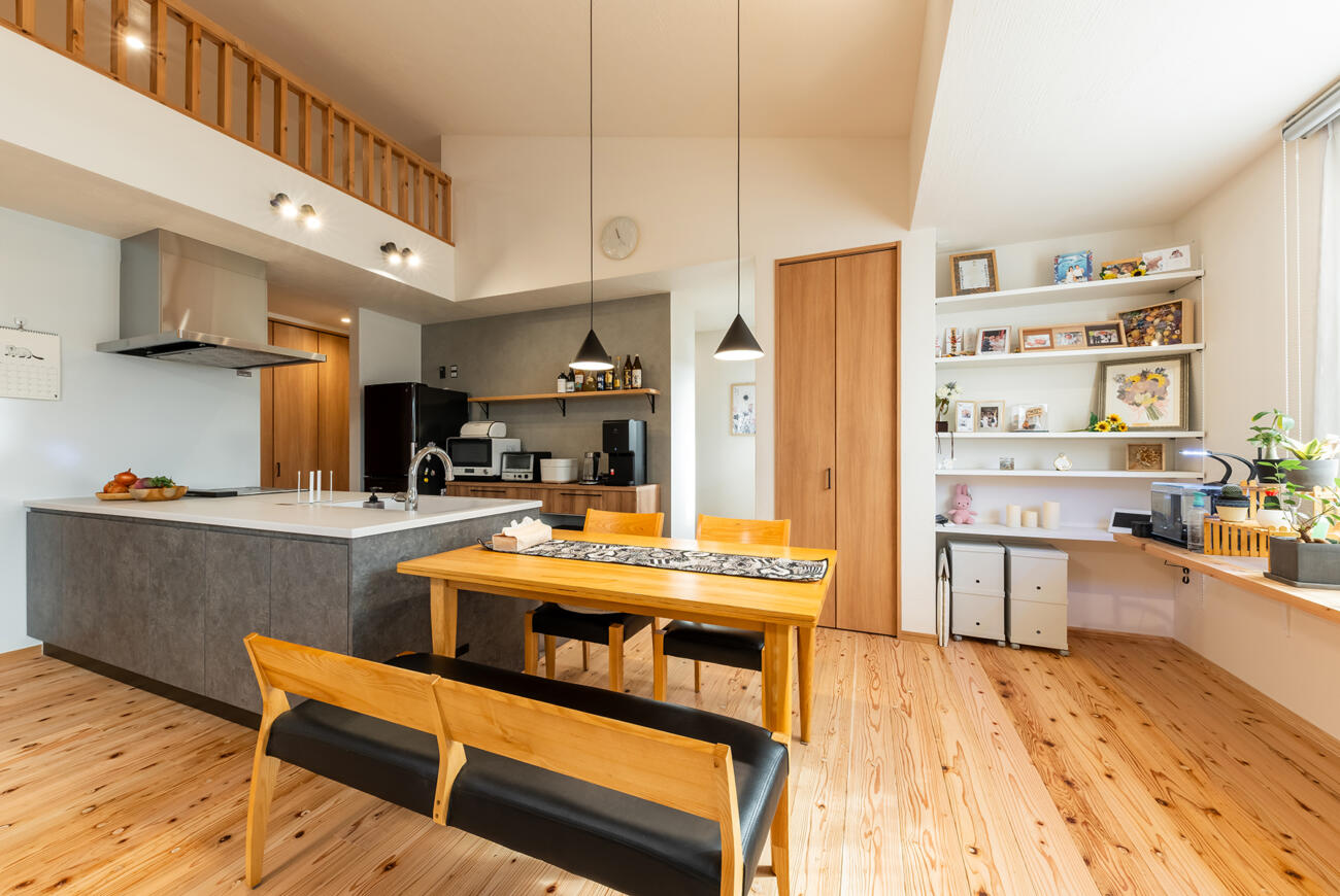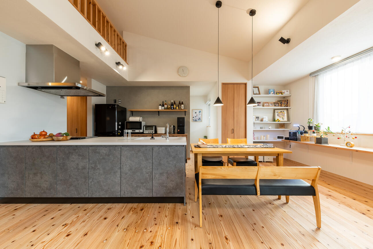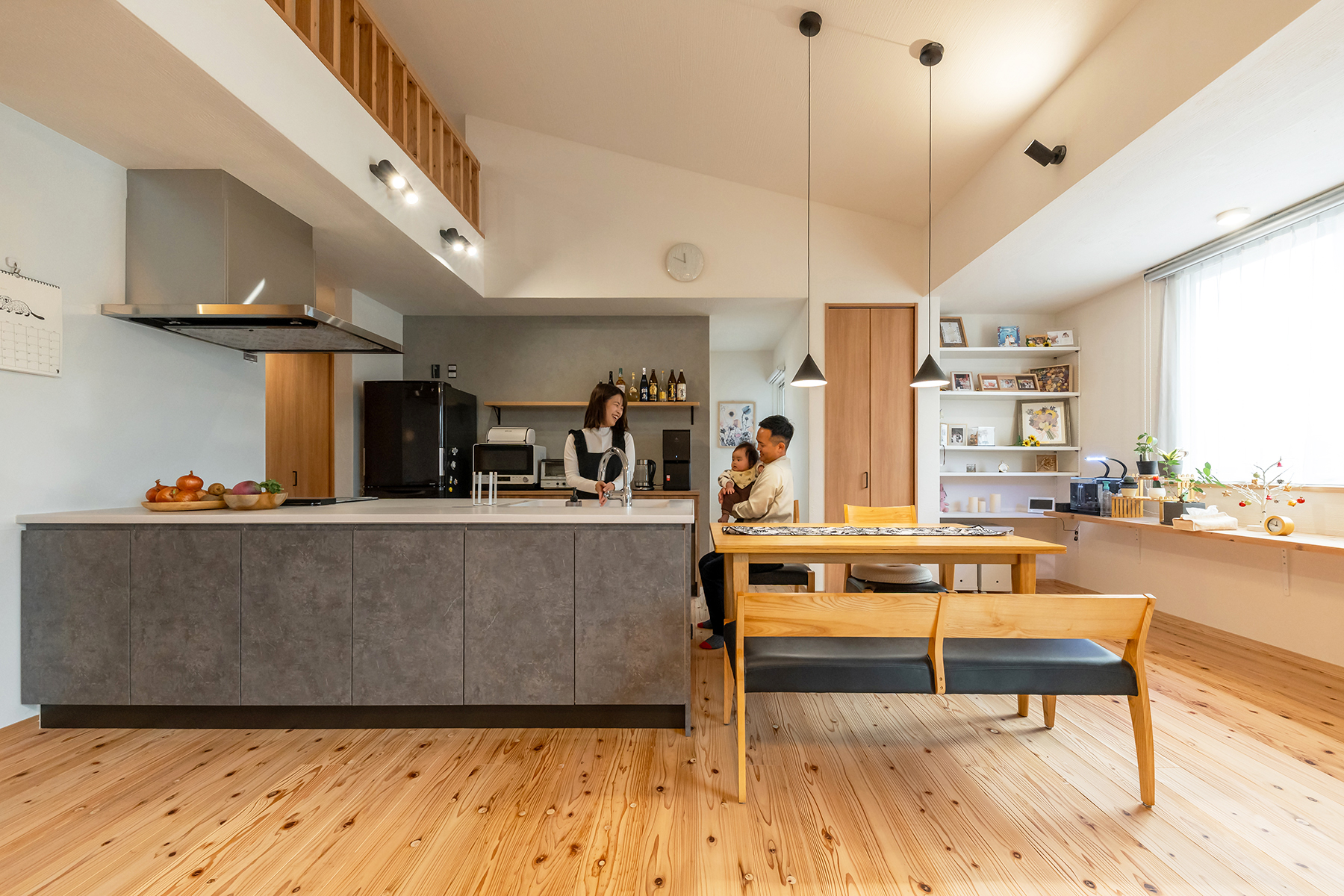 勾配をつけた天井とロフトが繋がり、開放感を演出したキッチンダイニング。