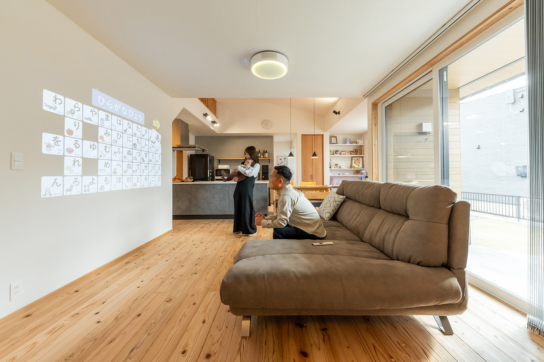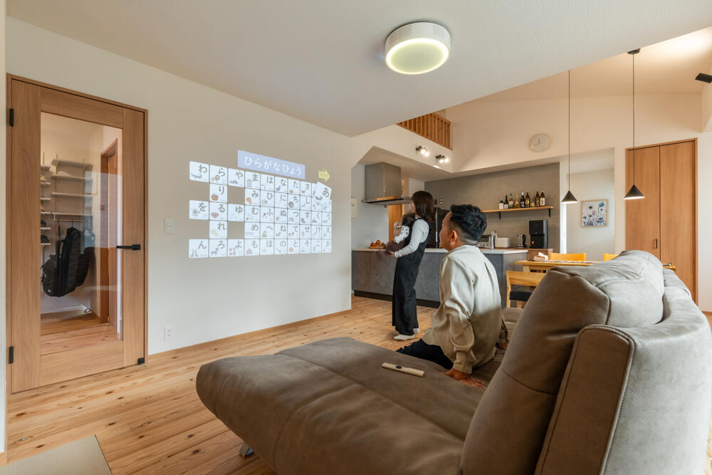 リビングにはテレビを設置せず、天井にシーリングライト一体型プロジェクターを採用。壁面は大画面のスクリーンに早変わり。
