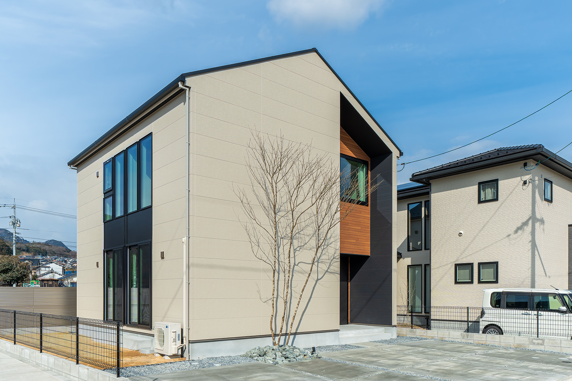 柔らかな色合いの外壁に、ブラックのサッシ枠をアクセントに採用することで、メリハリのあるスタイリッシュな外観に仕上げています。