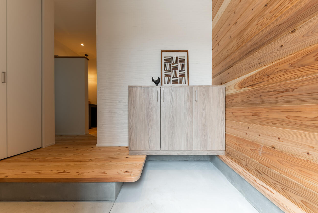 板張り壁でアクセントを加えた玄関。開けた瞬間に木の香りが迎えてくれます。
