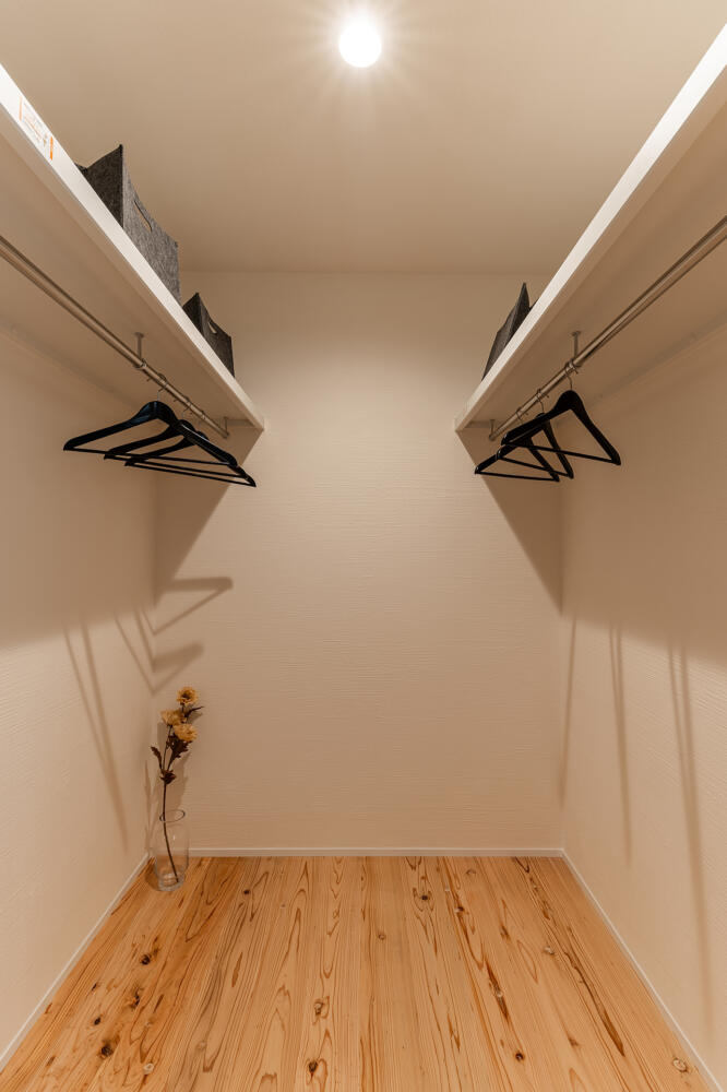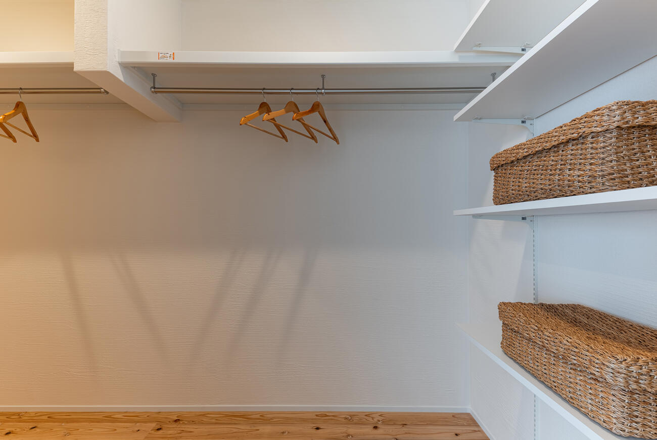 2帖のファミリークロークが繋がります。帰宅後、手を洗ってすぐにコートを収納したり、ランドリールームで完成した洗濯物をそのままファミリークロークへ。