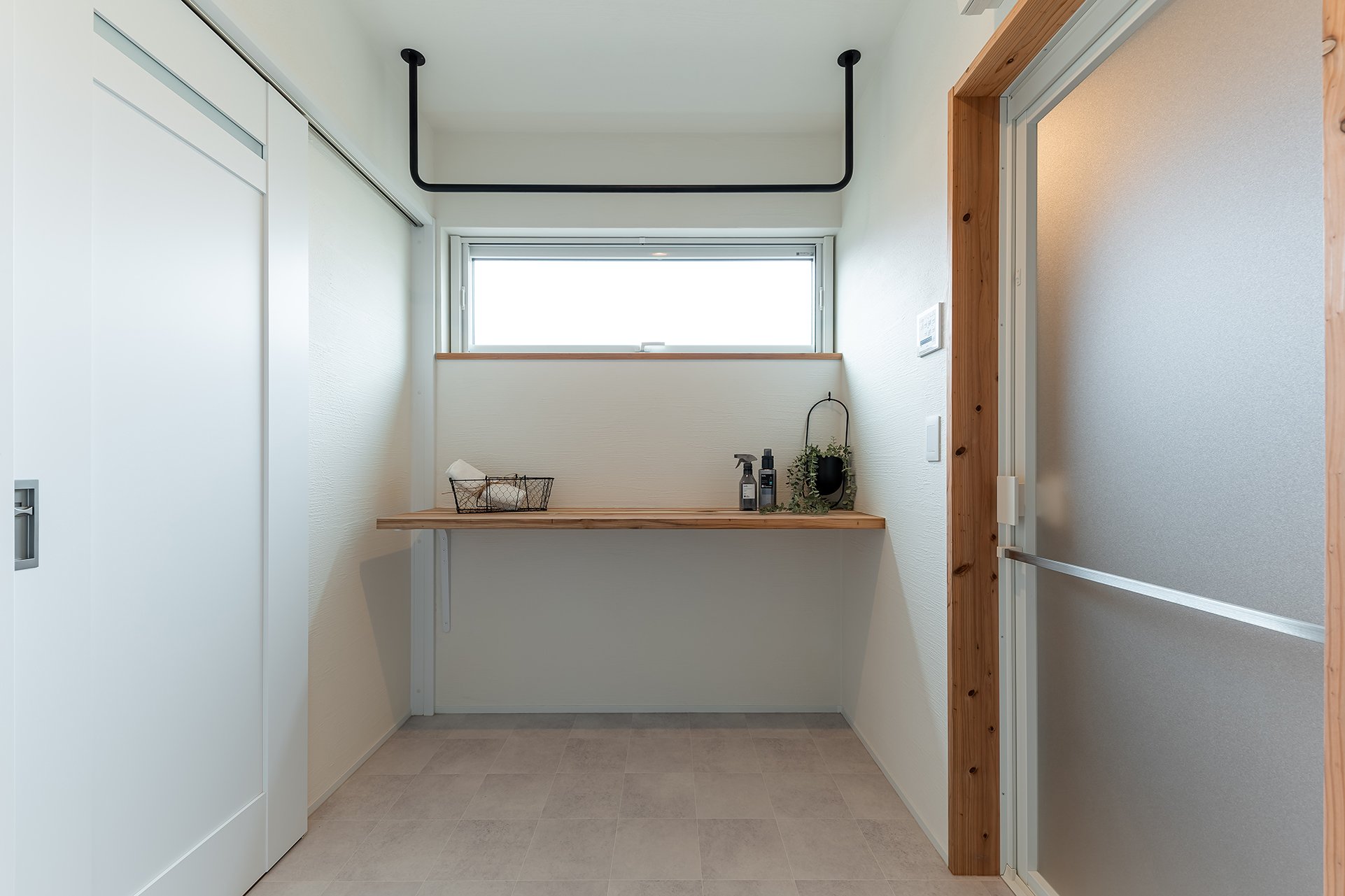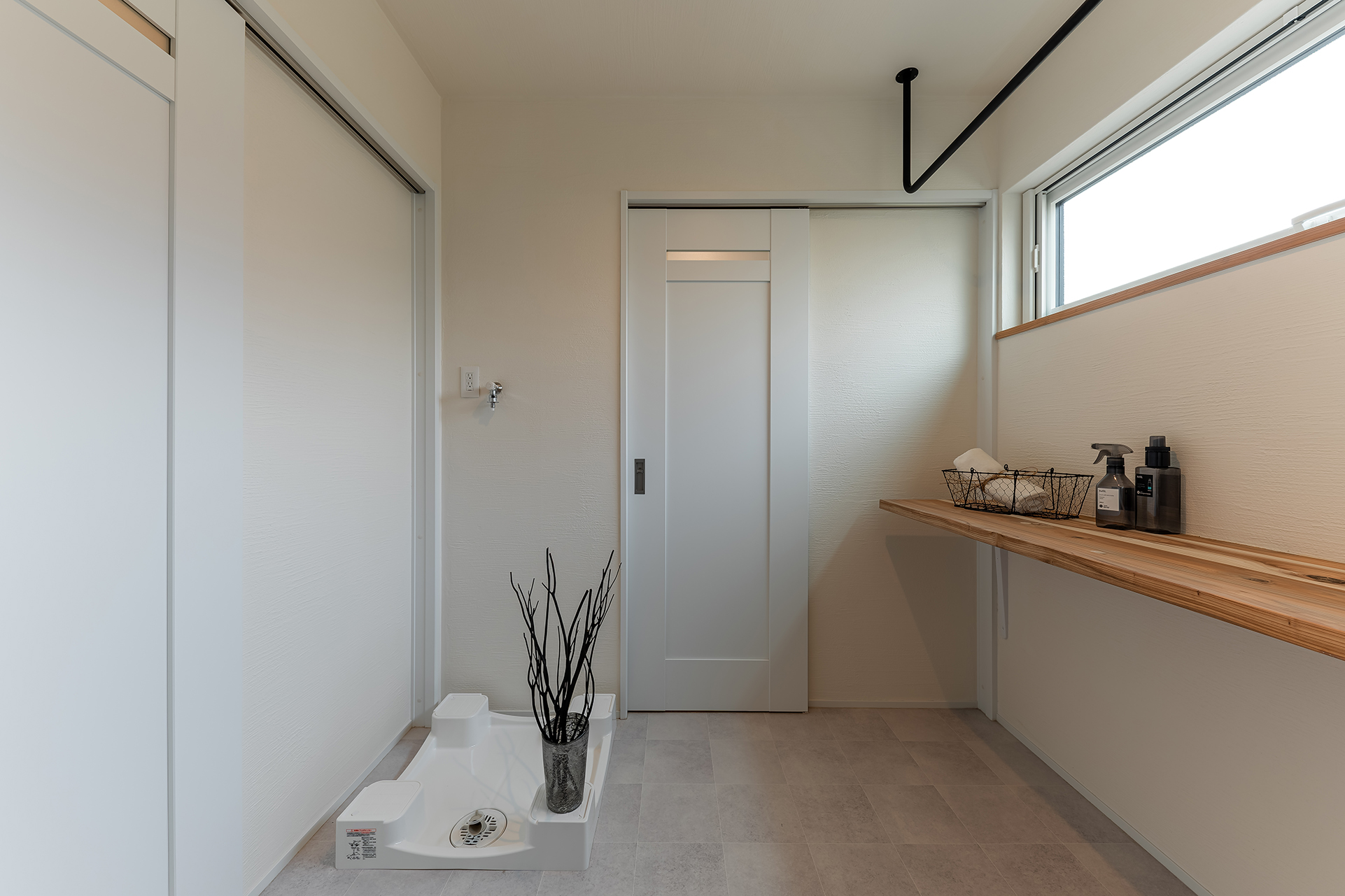 洗面所横の2.5帖ランドリールーム。実用性とデザイン性を兼ね備えたスタイリッシュな固定物干しを採用。家事の時間も楽しくなる工夫を✨