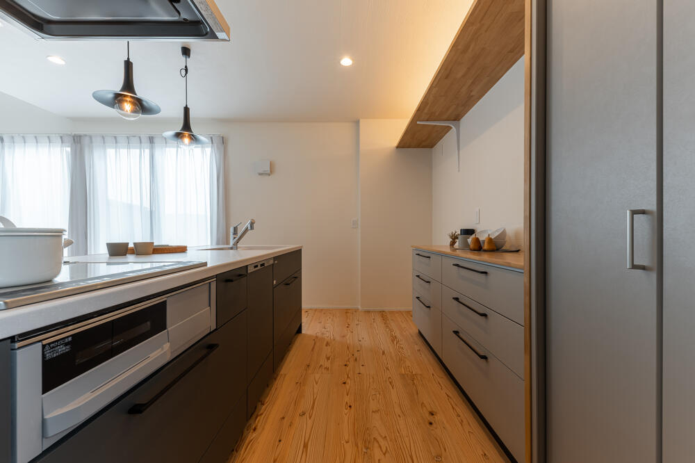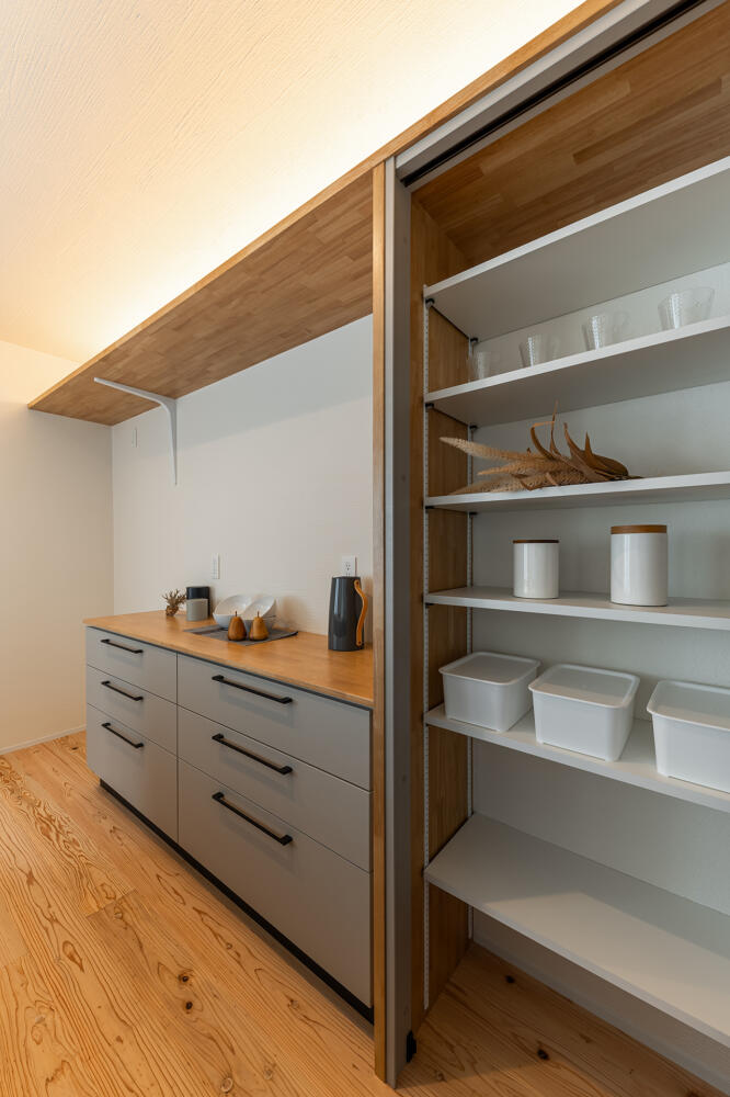カップボードにプラスしてパントリー収納も。キッチンとリビング、両方の整理整頓を叶えます。