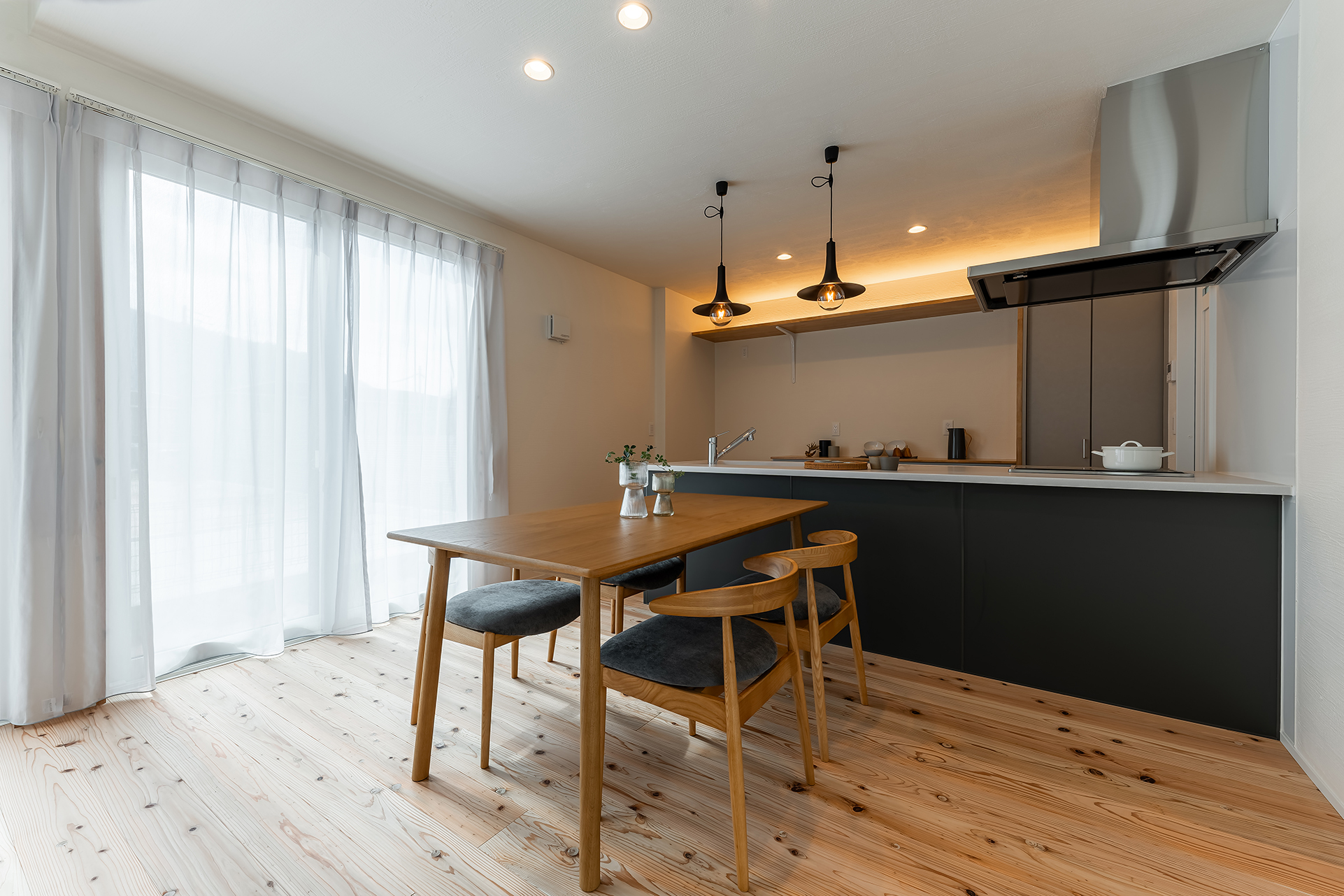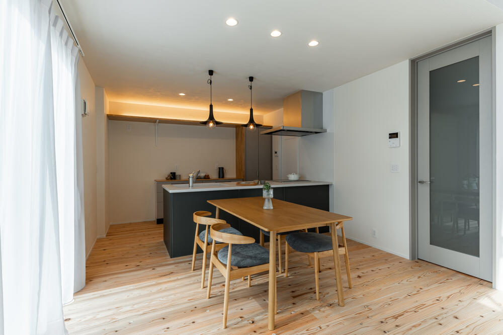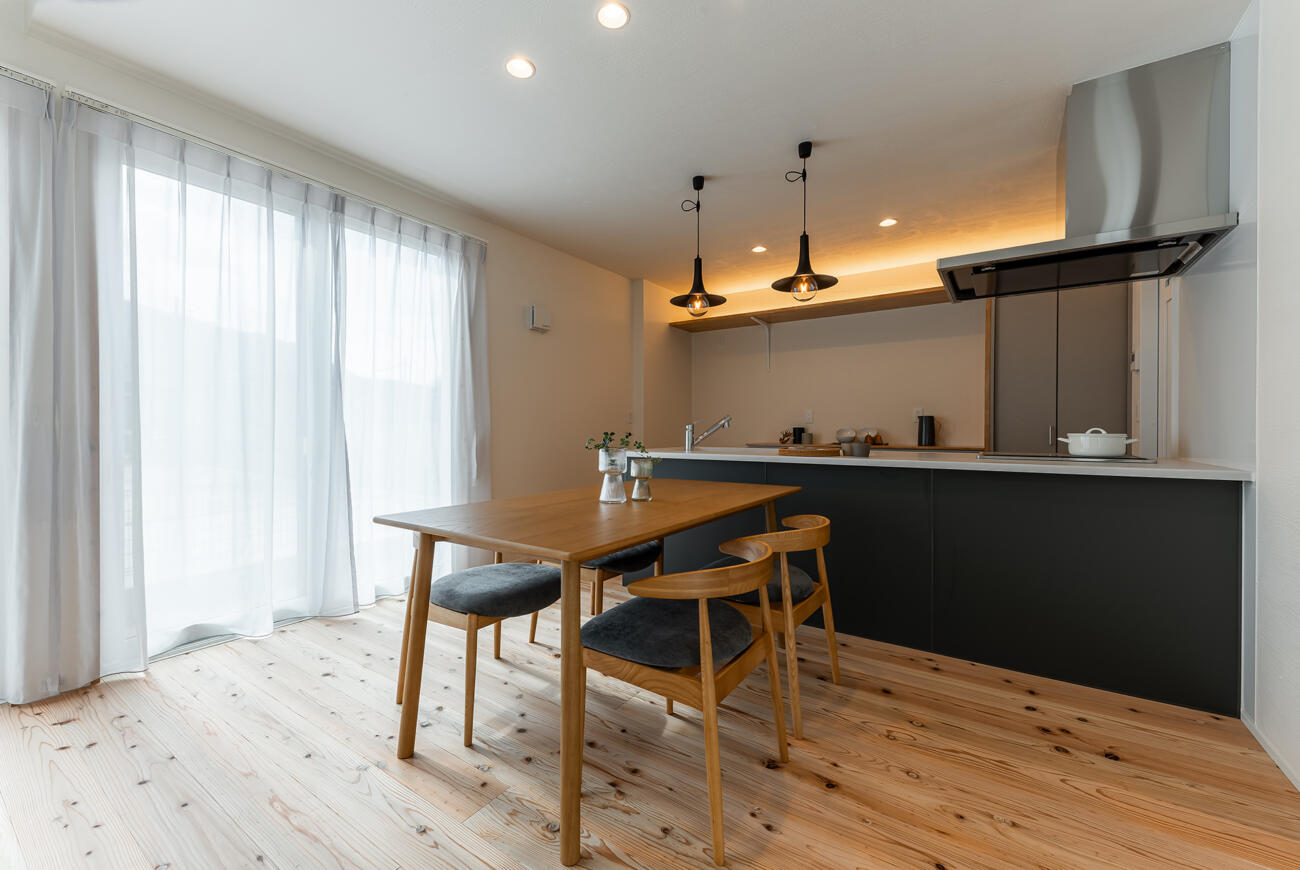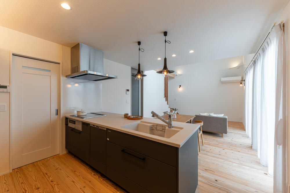 ダイニング、リビングを見渡せる対面キッチン。配膳、片付けもスムーズに!