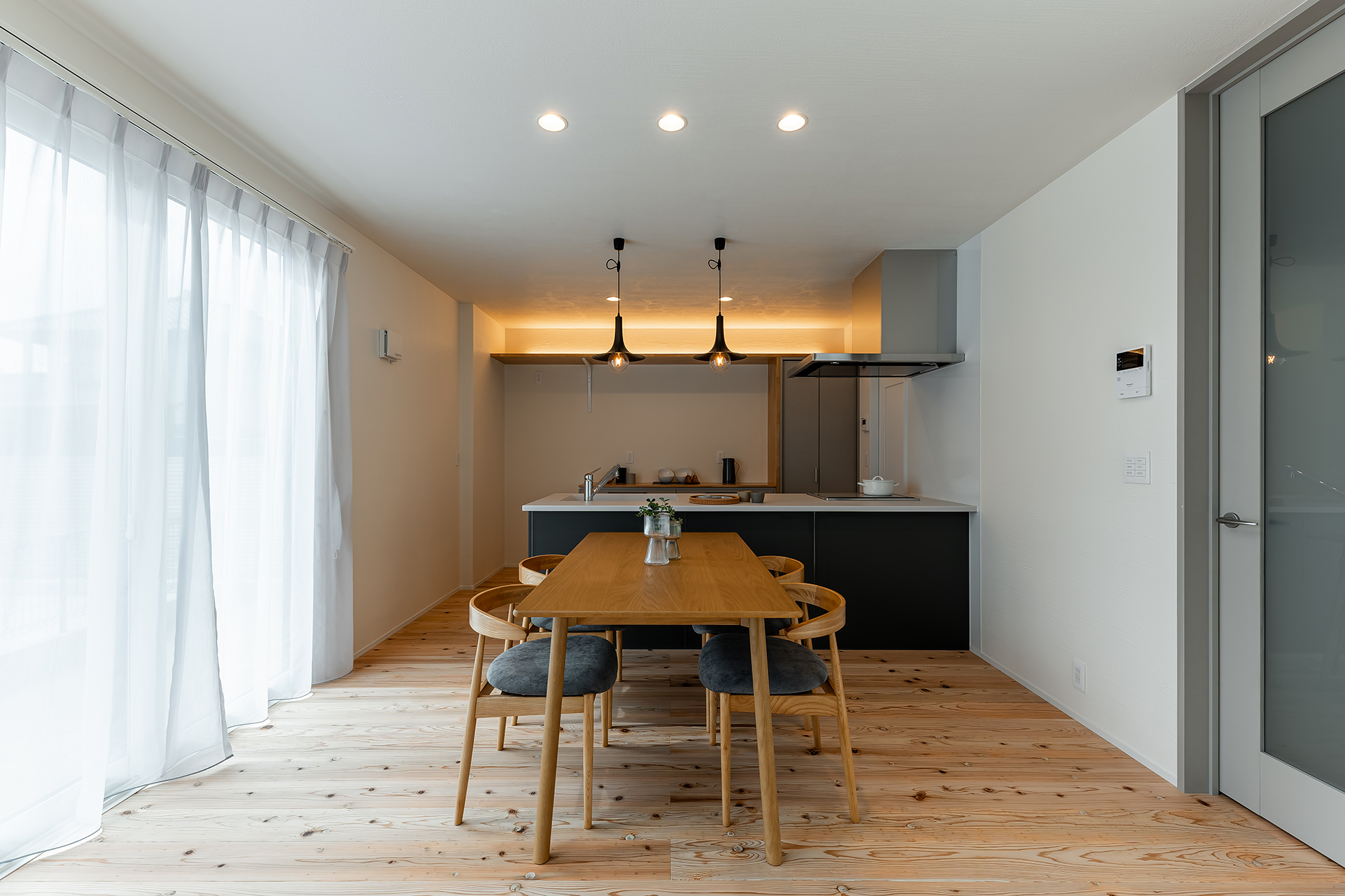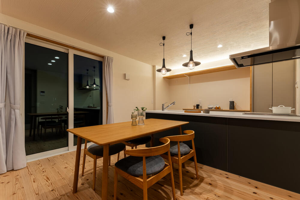 間接照明をカップボード上部に造作。ゆるやかな光が食卓を彩ります。