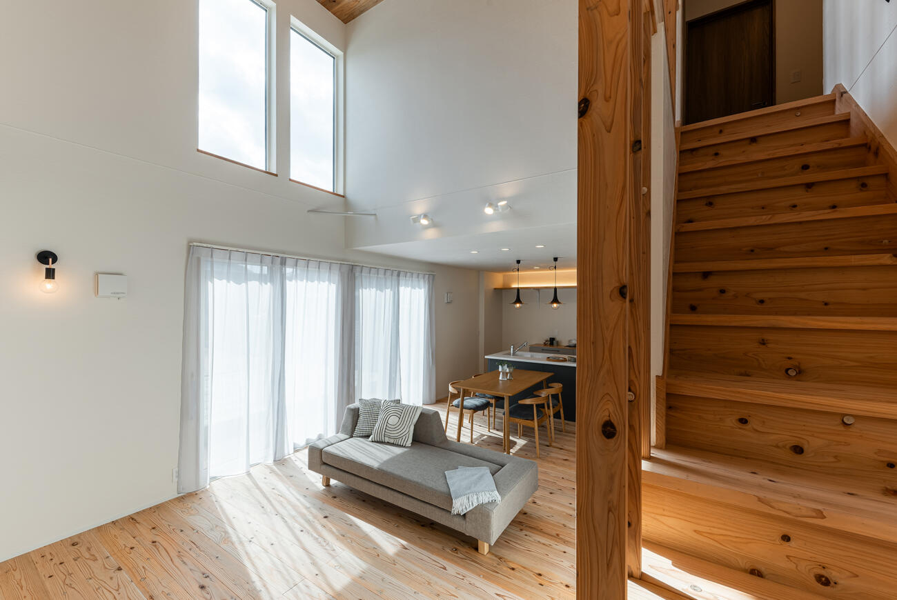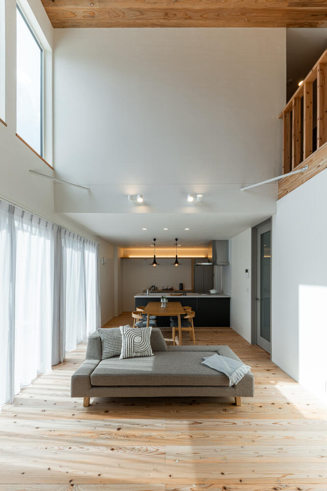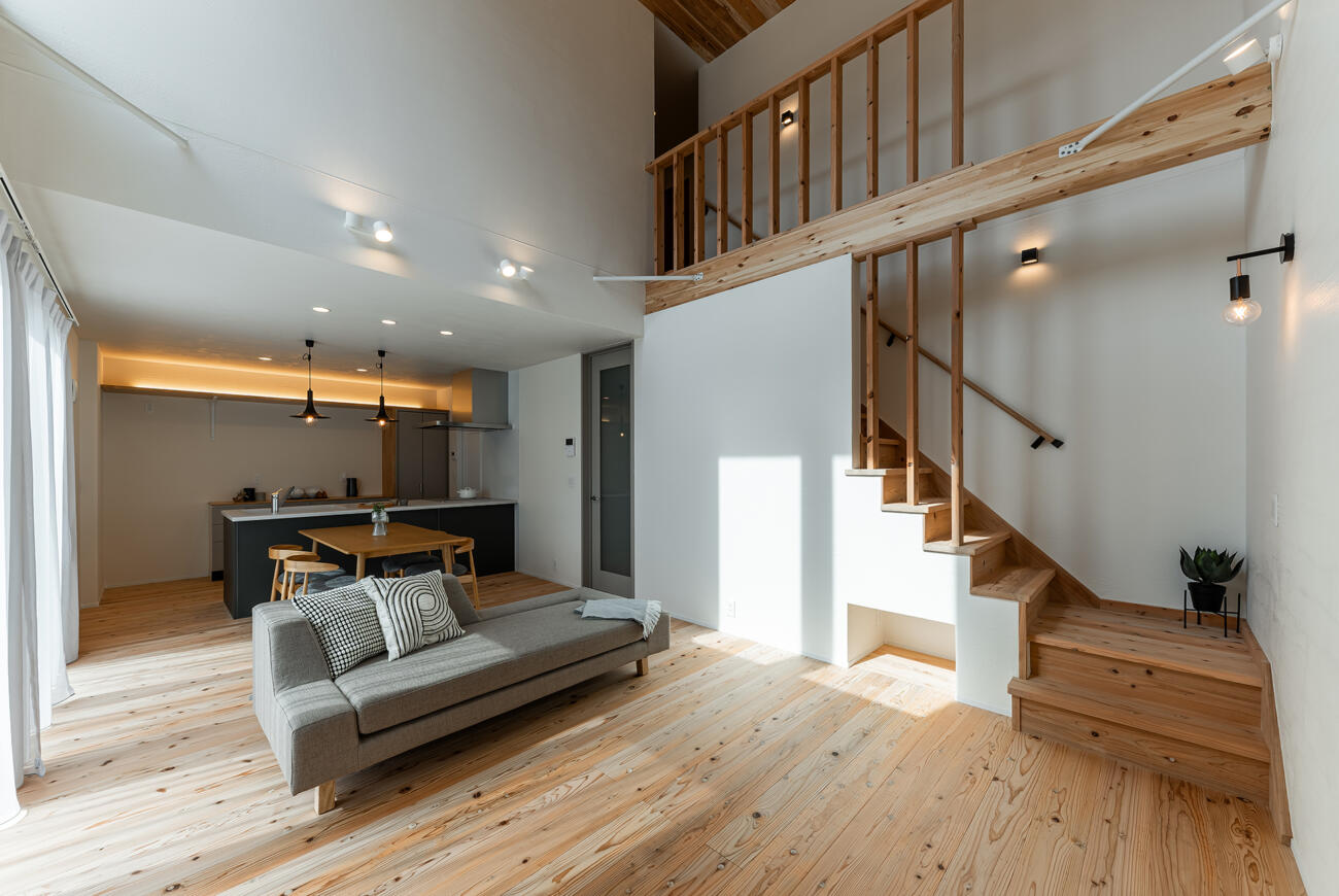 リビングには大空間の吹き抜けを設けて開放感を演出しています。