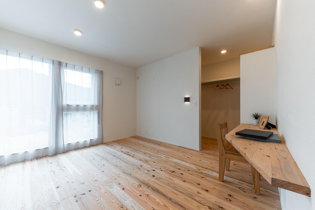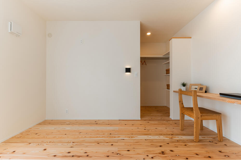 7帖の主寝室の一角には、造りつけのワークスペースを設置。在宅ワークはもちろん、ドレッサーとしてもマルチに活躍します。