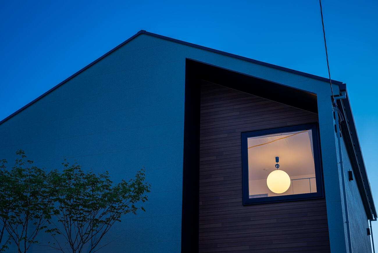夜空に映える四角い窓と、そこからのぞく丸い明かり。直線的な外観に、照明ひとつで優しい表情をプラス✨