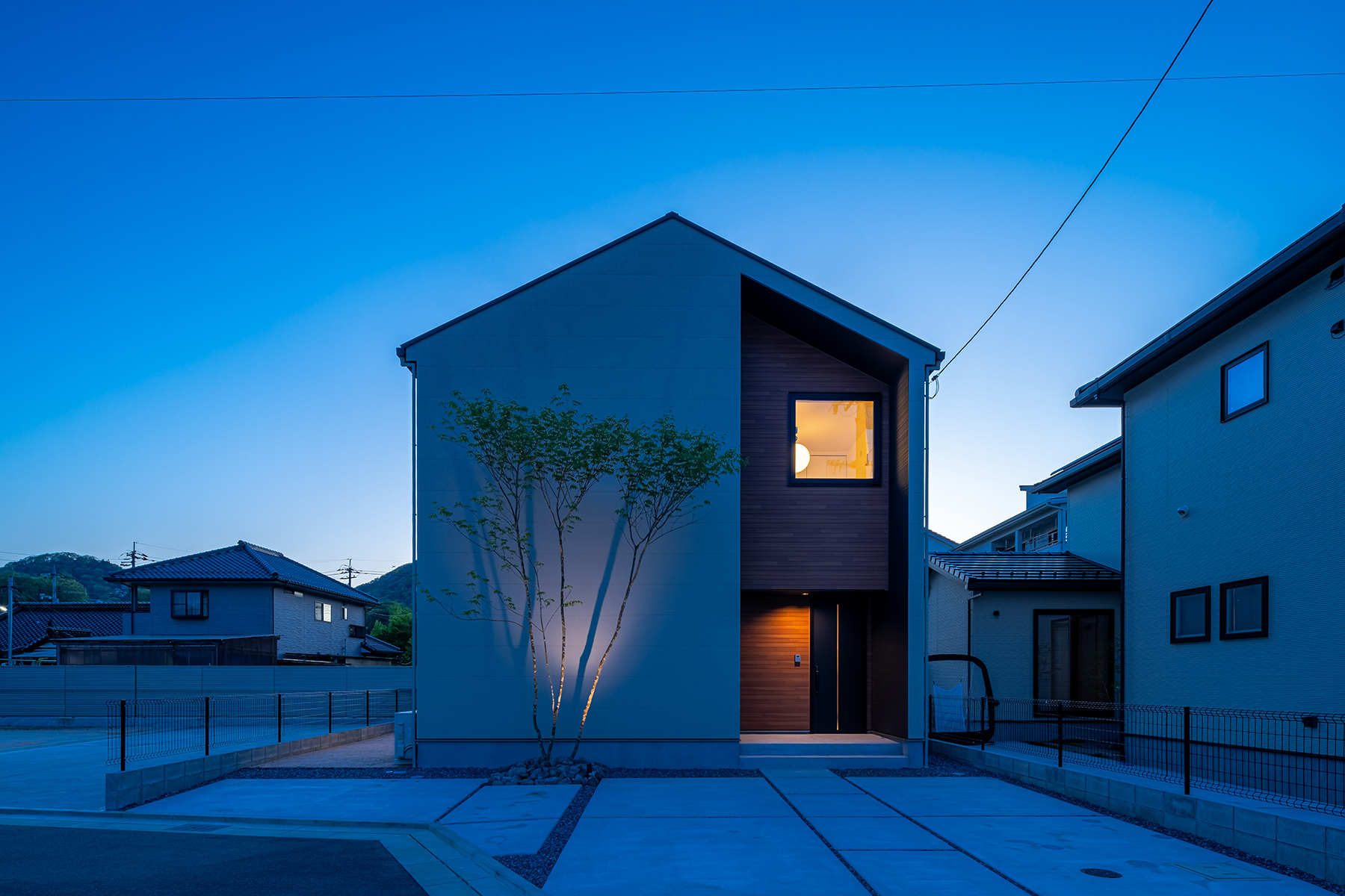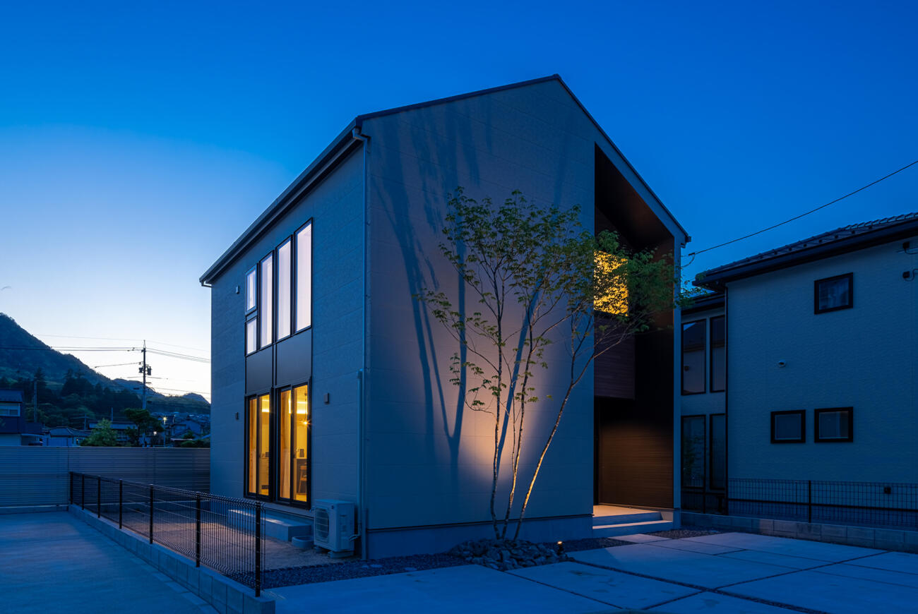 外構のライトアップと室内灯によって、昼とは異なった表情を楽しめる夕景の家。