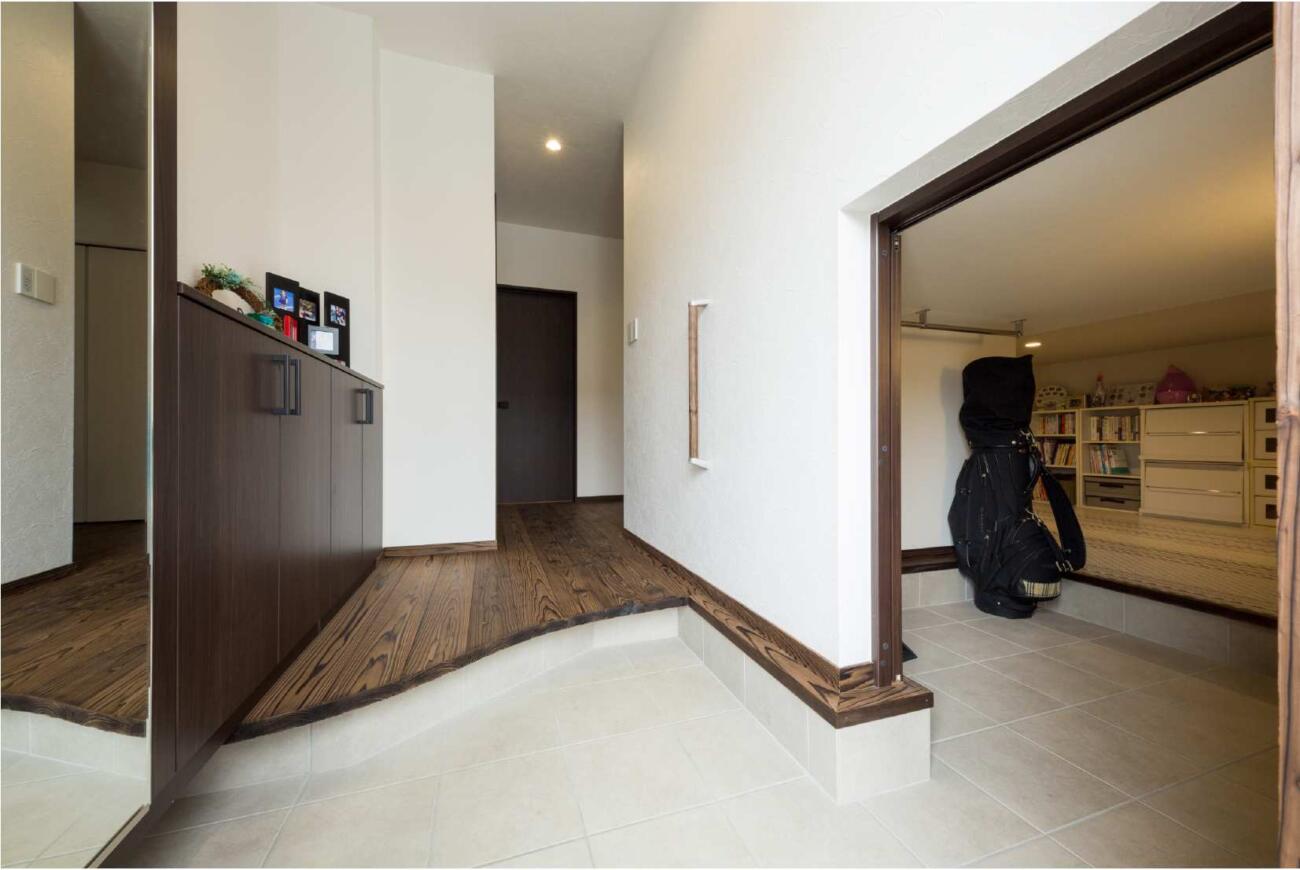 玄関から土間続きでワイドに広がる収納スペースが。低めの天井高ながらIさんのご要望通り収納力はたっぷり。