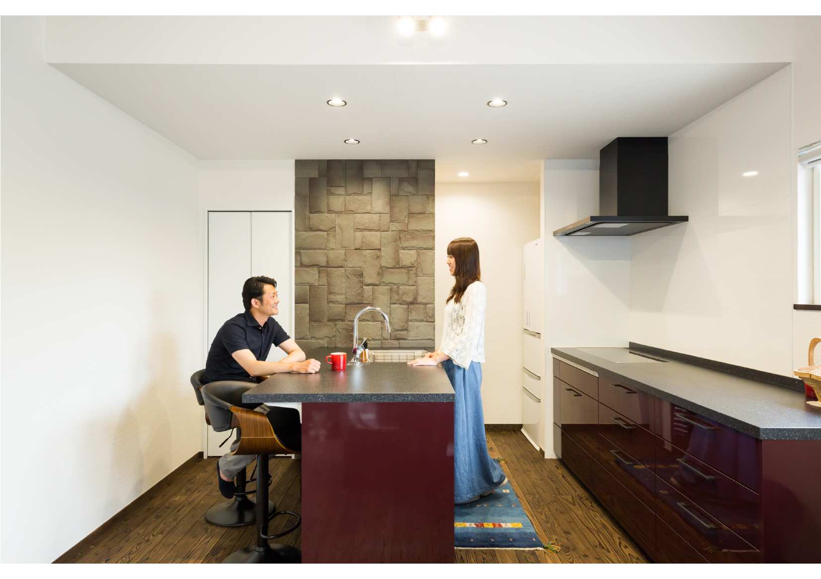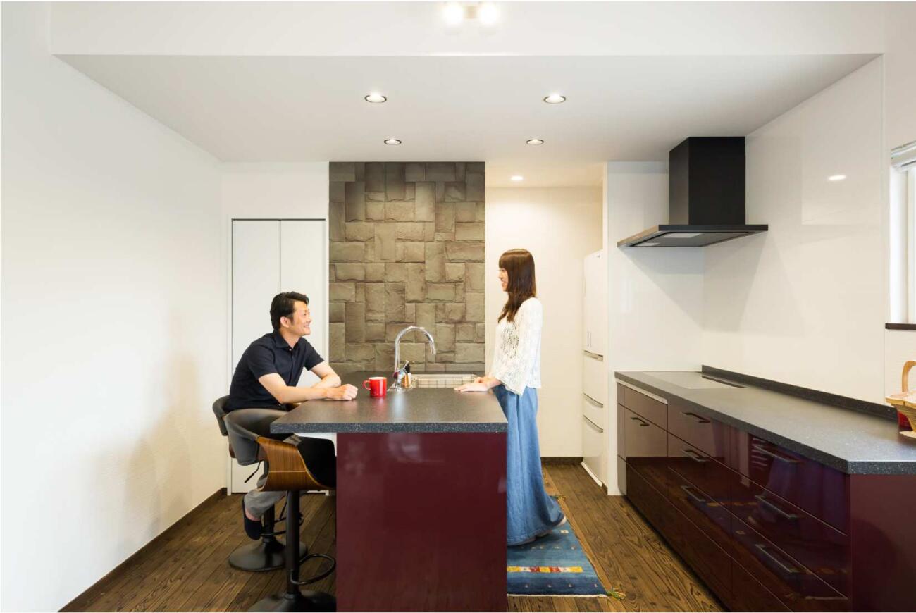 建設地は冬の寒さが気になるエリアのため、「暖かい家」が欲しいこと、収納をたくさん作りたい、シンプルで機能的なデザインに…など、Iさんの要望に沿って「2階リビング」というプランニングを提案。「当初は想像もしていなかったので戸惑いましたが、まわりの視線を気にせずくつろげるというメリットを知って採用することに。開放的に過ごせるリビング・ダイニングが今では一番お気に入りです」と絶賛。モダンなインテリアコーディネートでおしゃれ感あふれる住まいが完成。