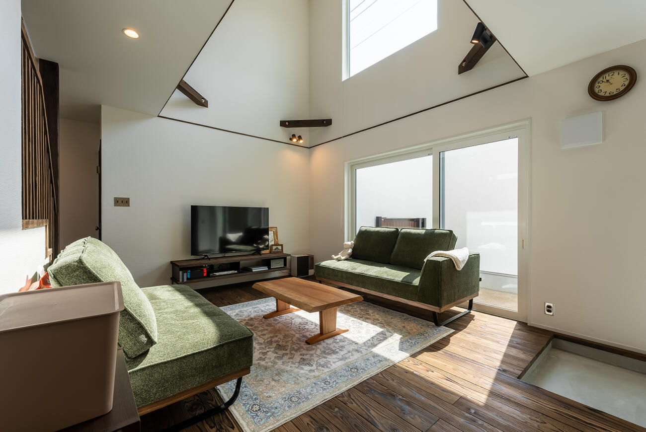 20帖の吹抜けLDK。カーテンなしで中庭と繋がり、明るく開放的に。