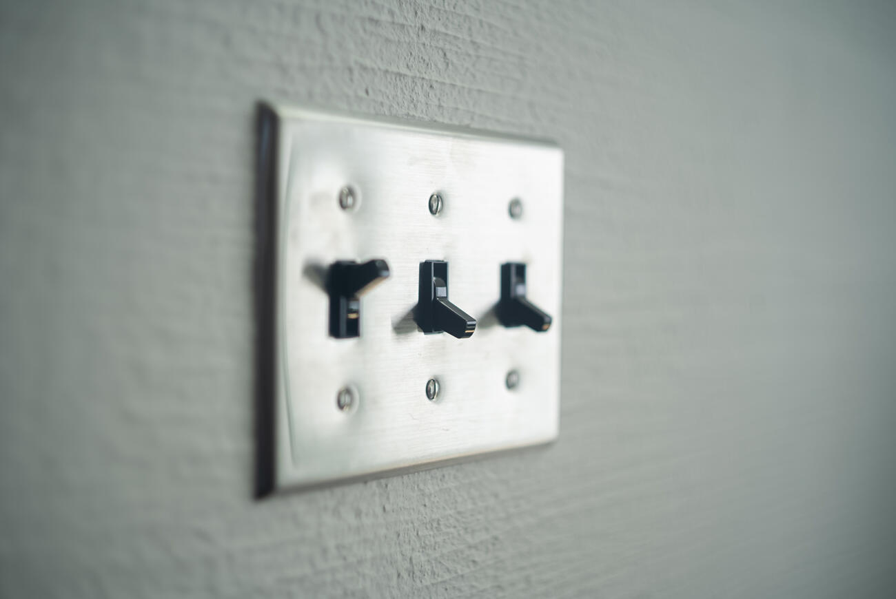 ステンレス製のオシャレな電気スイッチ。コンセントも同じ種類のステンレス製を採用。